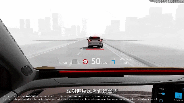 若车辆与前车发生碰撞时,一条醒目的红色灯带会迅速在挡风玻璃下方亮起,以强烈的视觉冲击力提醒驾驶者注意危险,并采取紧急制动或其他避险措施,确保行车安全。